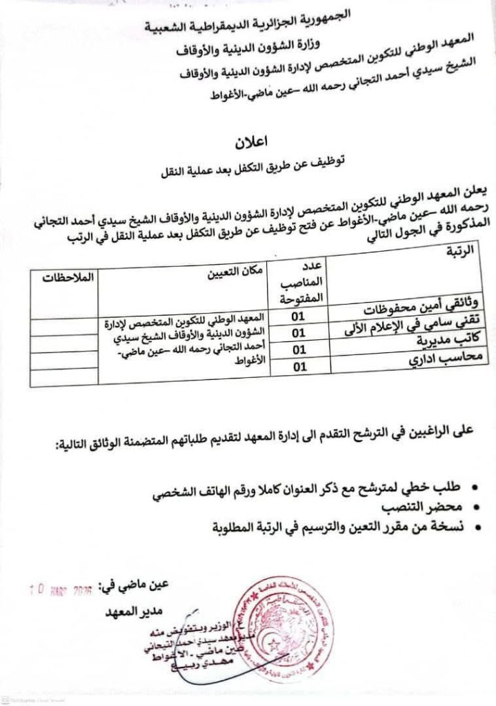 يعلن المعهد الوطني للتكوين المتخصص لإدارة الشؤون الدينية والأوقاف الشيخ سيدي أحمد التجاني رحمه الله – عين ماضي – الأغواط عن فتح توظيف عن طريق التكفل بعد عملية النقل في الرتب المذكورة في الجدول التالي: