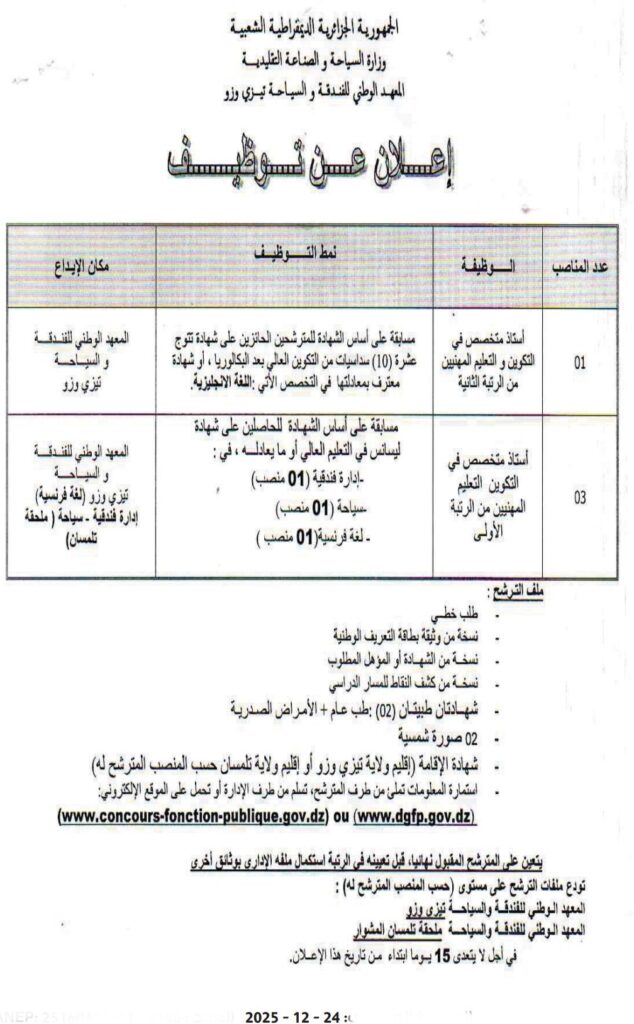 اعلان توظيف بالمعهد الوطني للفندقة والسياحة بتيزي وزو