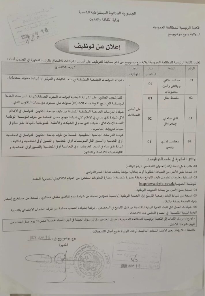 اعلان توظيف بالمكتبة الرئيسية للمطالعة العمومية لولاية برج بوعريريج