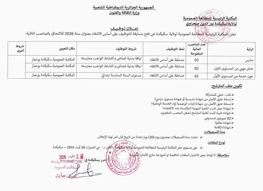 تعلن المكتبة الرئيسية للمطالعة العمومية لولاية سكيكدة عن فتح مسابقة للتوظيف على أساس الانتقاء بعنوان سنة 2026 للالتحاق بالمناصب التالية: