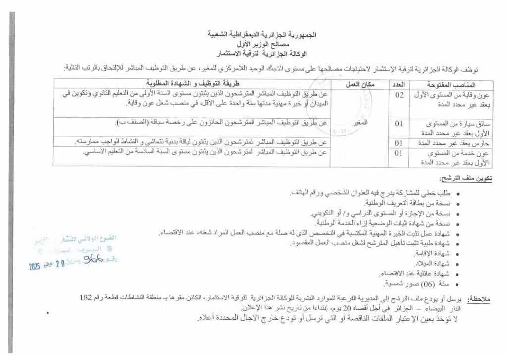 تعلن الوكالة الجزائرية لترقية الاستثمار عن فتح توظيف مباشر لتدعيم مصالحها على مستوى الشباك الوحيد اللامركزي بالمغير، وذلك للالتحاق بالرتب التالية: