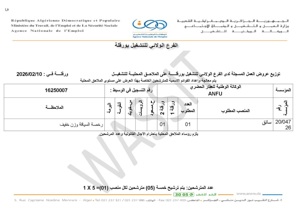 جهة المصدرة: الجمهورية الجزائرية الديمقراطية الشعبية – وزارة العمل والتشغيل والضمان الاجتماعي – الوكالة الوطنية للتشغيل (ANEM).