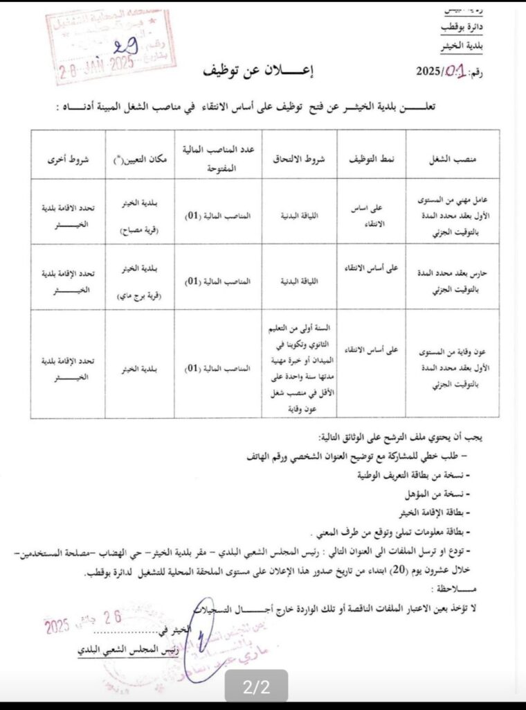 | عامل مهني من المستوى الأول | عقد محدد المدة بالتوقيت الجزئي | 01 | بلدية الخيثر (قرية مصباح) | اللياقة البدنية، تحديد الإقامة ببلدية الخيثر |
