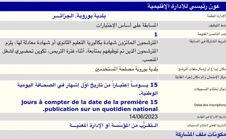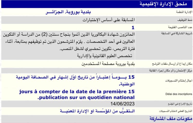 تعلن بلدية بوروبة ولاية الجزائر عن فتح مسابقة توظيف على أساس الاختبارات في الرتب التالية