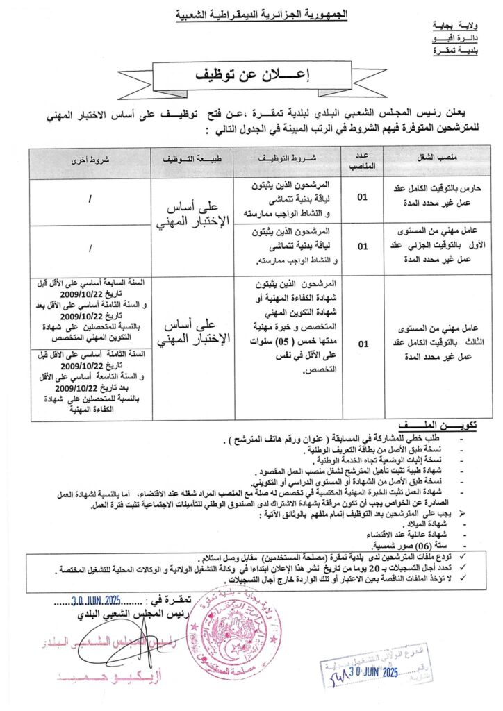 اعلان توظيف ببلدية تمقرة ولاية بجاية