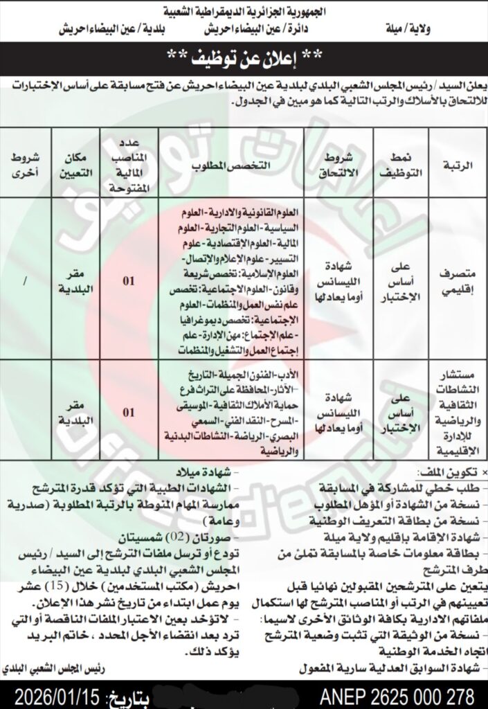 اعلان توظيف ببلدية عين البيضاء احريش ولاية ميلة