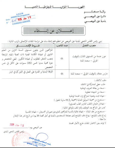 اعلان توظيف ببلدية عين النويصي ولاية مستغانم