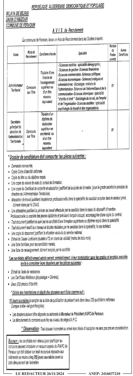 اعلان توظيف ببلدية فرعون ولاية بجاية