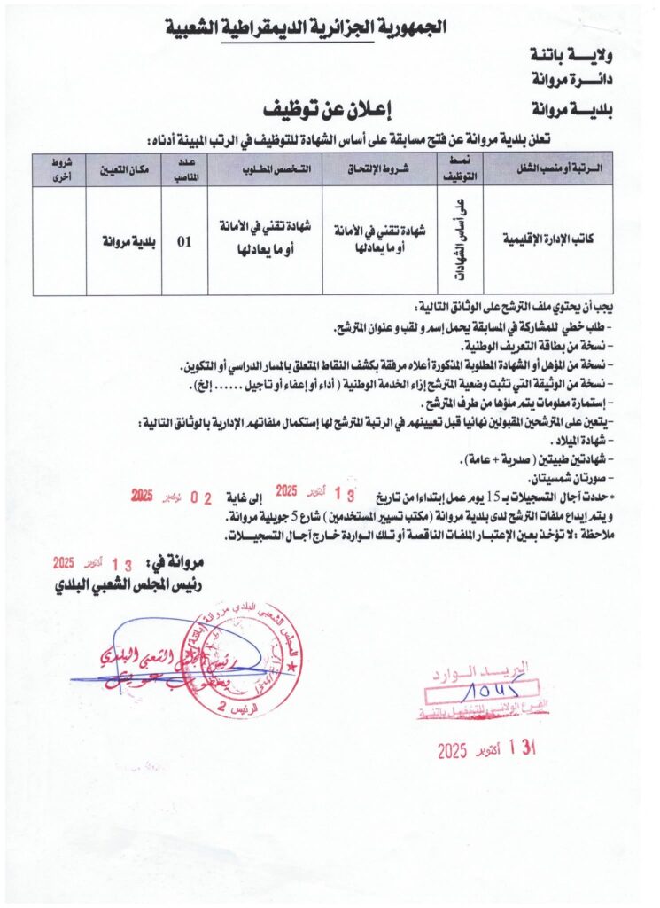 اعلان توظيف ببلدية مروانة ولاية باتنة