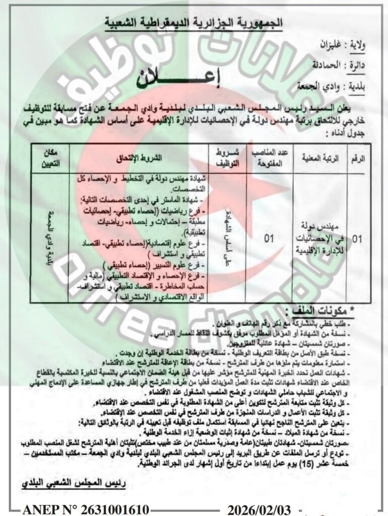 يعلن السيد رئيس المجلس الشعبي البلدي لبلدية وادي الجمعة عن فتح مسابقة للتوظيف الخارجي للالتحاق برتبة مهندس دولة في الإحصائيات للإدارة الإقليمية على أساس الشهادة كما هو مبين في الجدول أدناه: