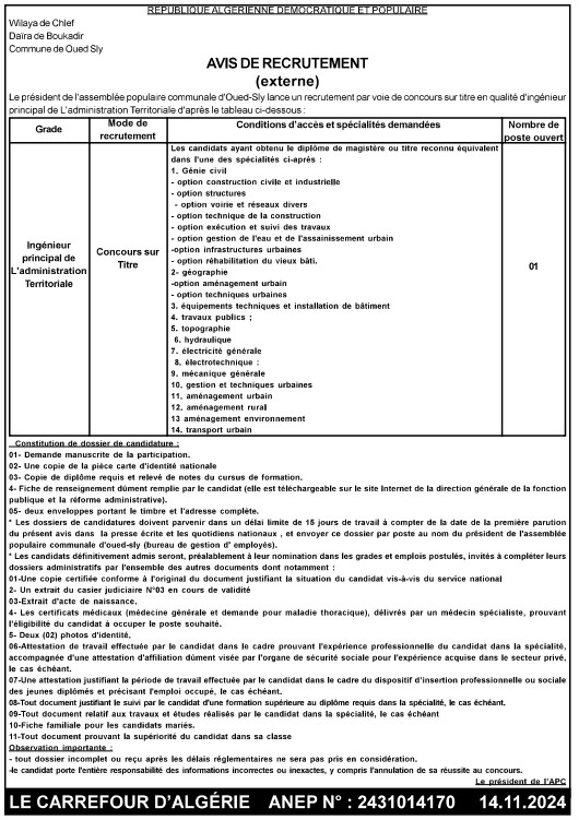 يُعلن رئيس المجلس الشعبي البلدي لوادي سلي عن فتح مسابقة توظيف خارجي على أساس الشهادة للتوظيف في رتبة: