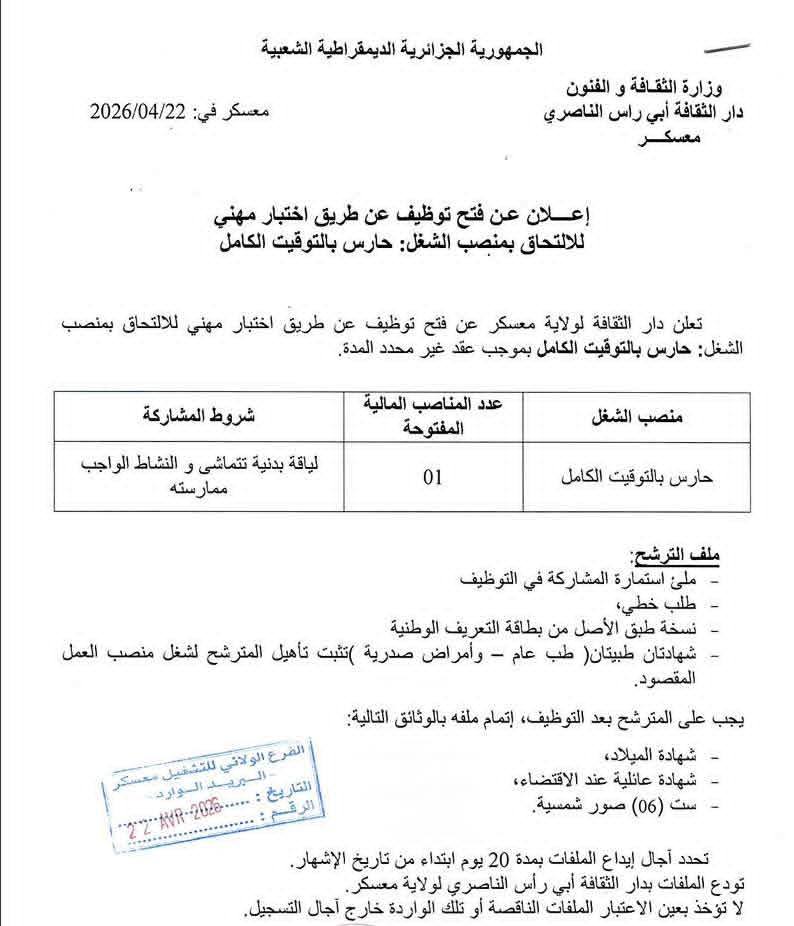 تعلن دار الثقافة لولاية معسكر عن فتح توظيف عن طريق اختبار مهني للالتحاق بمنصب الشغل: حارس بالتوقيت الكامل بموجب عقد غير محدد المدة.