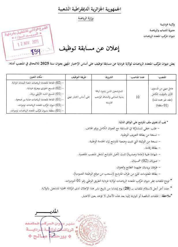 يعلن ديوان المركب المتعدد الرياضات لولاية غرداية عن تنظيم مسابقة توظيف على أساس الاختبار المهني بعنوان سنة 2025، للالتحاق بالمنصب المبين أدناه: