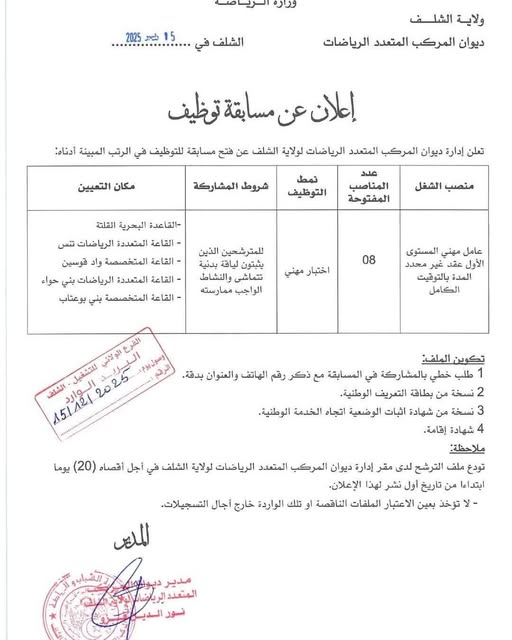 تعلن إدارة ديوان المركب المتعدد الرياضات لولاية الشلف عن فتح مسابقة للتوظيف في الرتب المبينة أدناه: