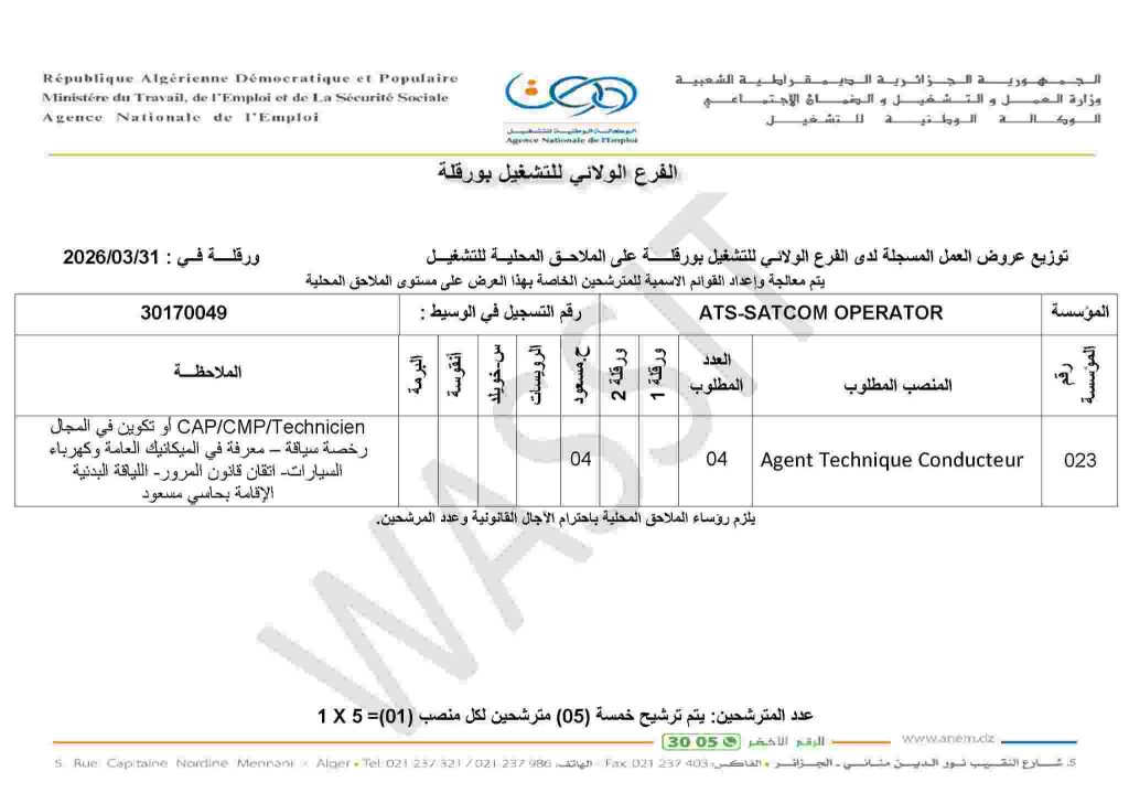 | ATS-SATCOM OPERATOR | Agent Technique Conducteur | 04 | CAP/CMP/Technicien أو تكوين في المجال رخصة سياقة – معرفة في الميكانيك العامة وكهرباء السيارات – اتقان قانون المرور – اللياقة البدنية الإقامة بحاسي مسعود |