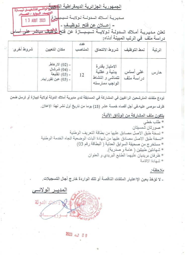 تعلن مديرية أملاك الدولة لولاية تيبازة عن فتح توظيف مباشر على أساس الشهادة في الرتب التالية