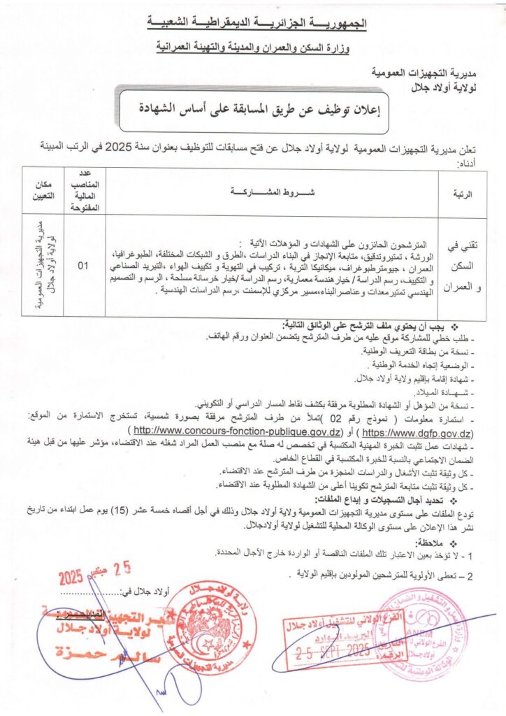 تعلن مديرية التجهيزات العمومية لولاية أولاد جلال عن فتح مسابقة توظيف على أساس الشهادة بعنوان سنة 2025، في الرتبة المبينة أدناه: