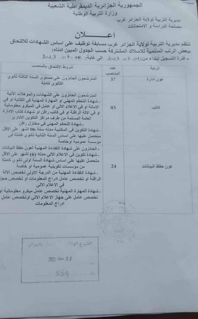 تعلن مديرية التربية الجزائر غرب عن فتح توظيف على اساس الشهادة للالتحاق الرتب المبينة ادناه