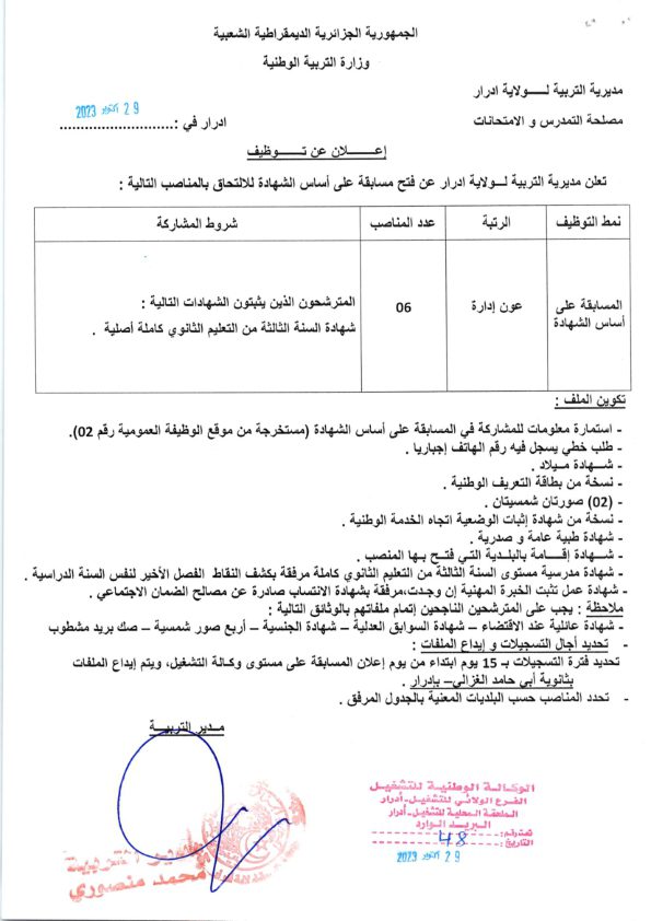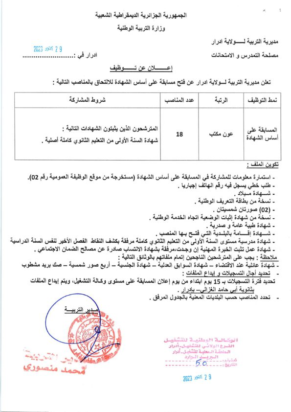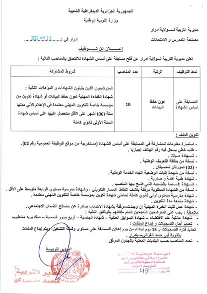 تعلن مديرية التربية لولاية أدرار عن فتح مسابقة توظيف على أساس الشهادة في الرتب التالية