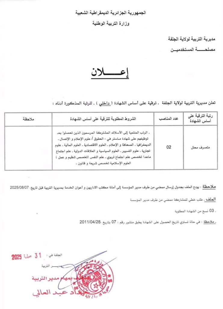 تعلن مديرية التربية لولاية الجلفة عن فتح عملية الترقية على أساس الشهادة للرتبة المبينة أدناه: