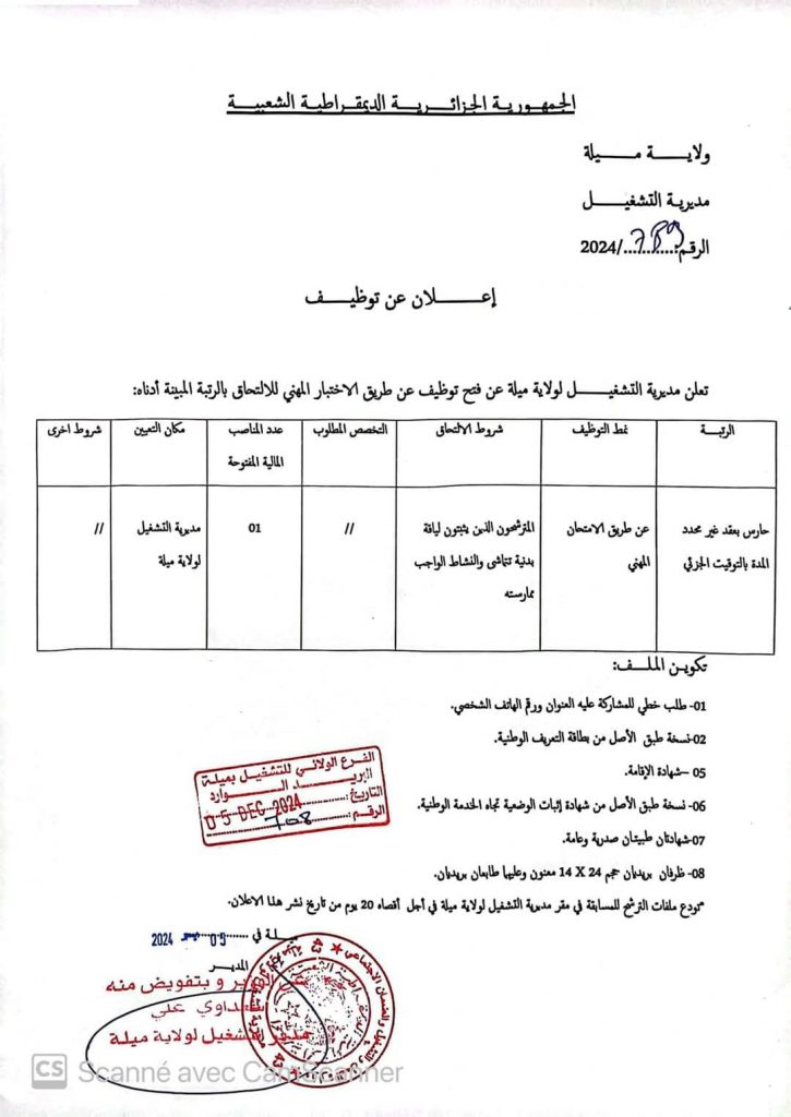 تعلن مديرية التشغيل لولاية ميلة عن فتح توظيف عن طريق الاختبار المهني للالتحاق بالرتبة المبينة أدناه: