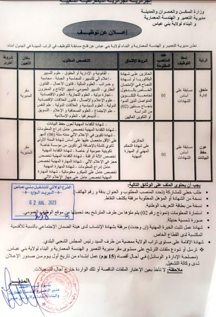 تعلن مديرية التعمير والهندسة المعمارية والبناء لولاية بني عباس عن فتح مسابقة للتوظيف في الرتب المبينة