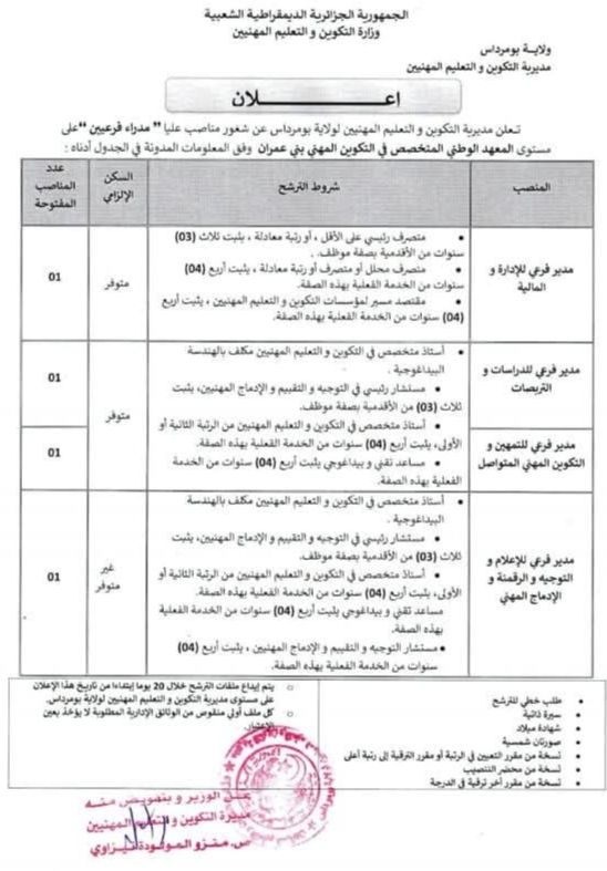 تعلن مديرية التكوين والتعليم المهنيين لولاية بومرداس عن شغور مناصب عليا “مدراء فرعيين” على مستوى المعهد الوطني المتخصص في التكوين المهني بني عمران وفق المعلومات المدونة في الجدول أدناه: