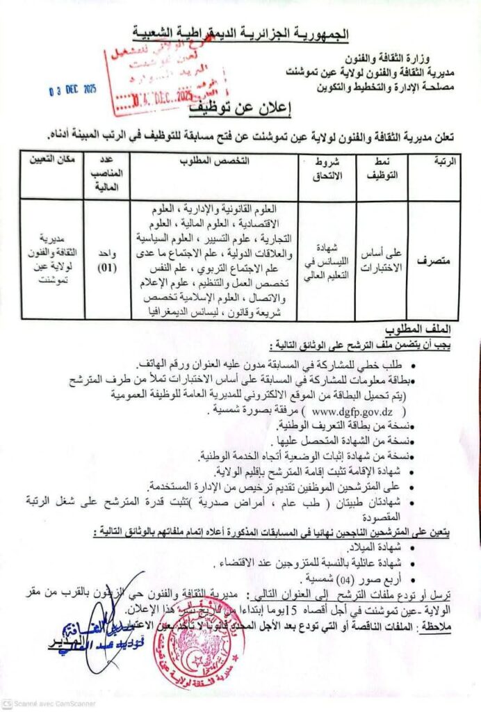 اعلان توظيف بمديرية الثقافة والفنون لولاية عين تموشنت