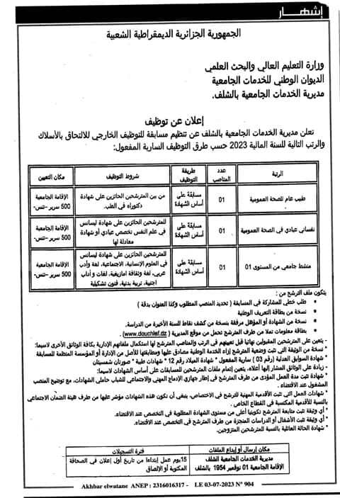 اعلان توظيف بمديرية الخدمات الجامعية بالشلف