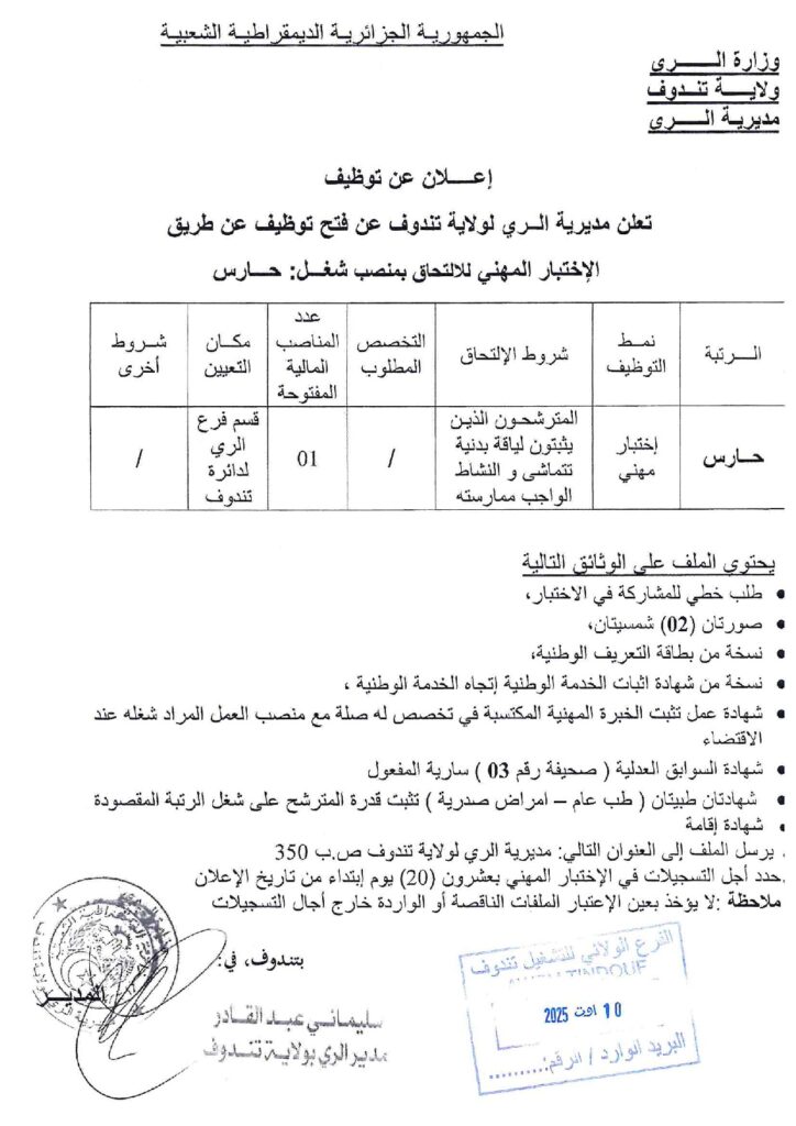 تعلن مديرية الري لولاية تندوف عن فتح توظيف عن طريق الاختبار المهني للالتحاق بالمنصب التالي: