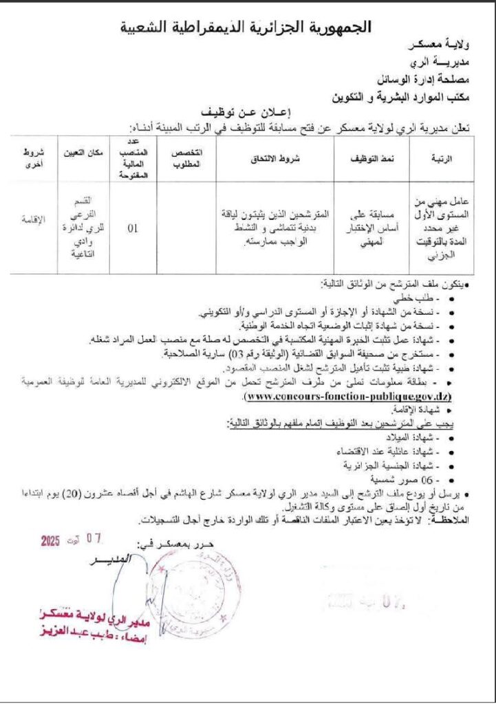 تعلن مديرية الري لولاية معسكر عن فتح مسابقة للتوظيف على أساس الاختبار في الرتبة المبينة أدناه: