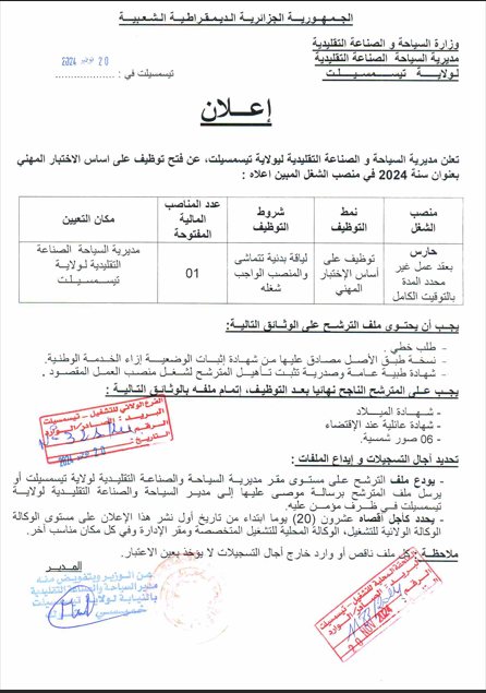 تعلن مديرية السياحة والصناعة التقليدية لولاية تيسمسيلت عن فتح مسابقة للتوظيف على أساس الاختبار المهني بعنوان سنة 2024 لشغل المنصب التالي: