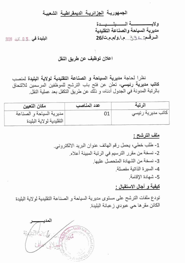 نظرا لحاجة مديرية السياحة والصناعة التقليدية لولاية البليدة لمنصب كاتب مديرية رئيسي، تعلن عن فتح باب الترشح للموظفين المرسمين للالتحاق بالرتبة المدونة في الجدول أدناه، وذلك عن طريق التكفل بعد عملية النقل.
