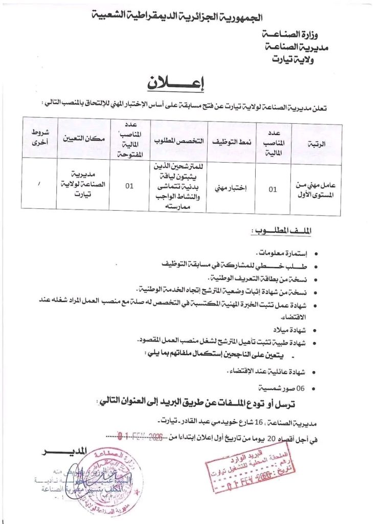 اعلان توظيف بمديرية الصناعة لولاية تيارت