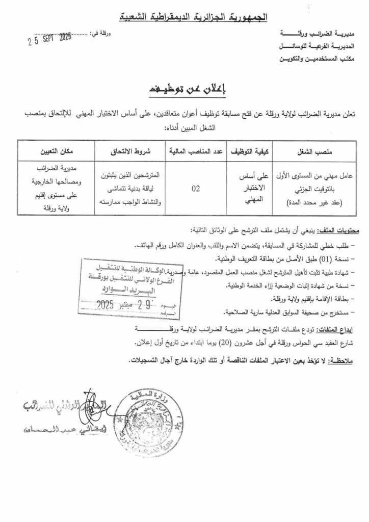 اعلان توظيف بمديرية الضرائب لولاية ورقلة