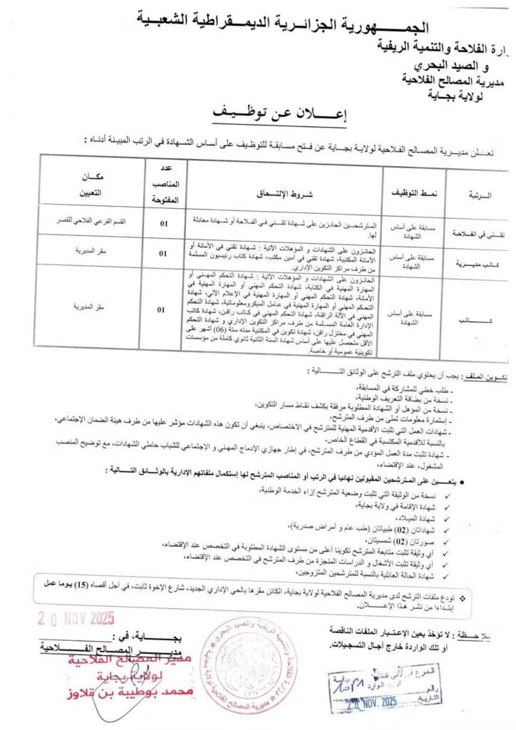 تعلن مديرية المصالح الفلاحية لولاية بجاية عن فتح مسابقة للتوظيف على أساس الشهادة في الرتب المبينة أدناه: