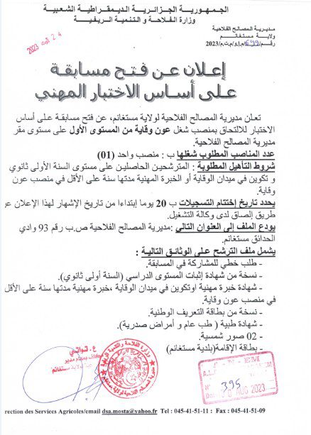 اعلان توظيف بمديرية المصالح الفلاحية ولاية مستغانم