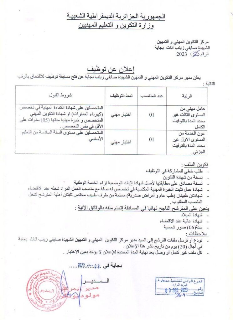 اعلان توظيف بمركز التكوين المهني والتمهين الشهيدة صايفي زينب بجاية