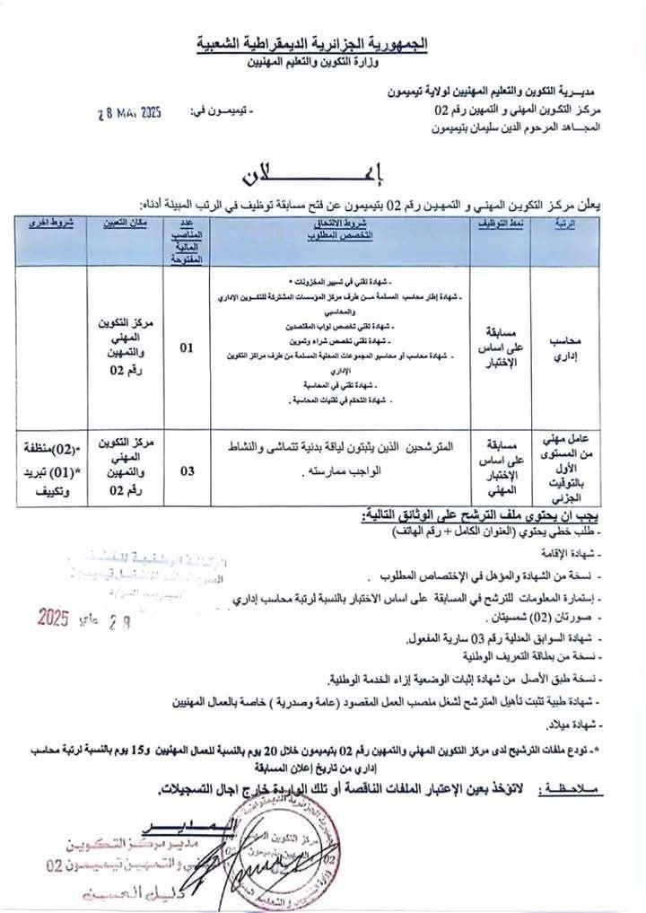 اعلان توظيف بمركز التكوين المهني والتمهين رقم 02 بتيميمون
