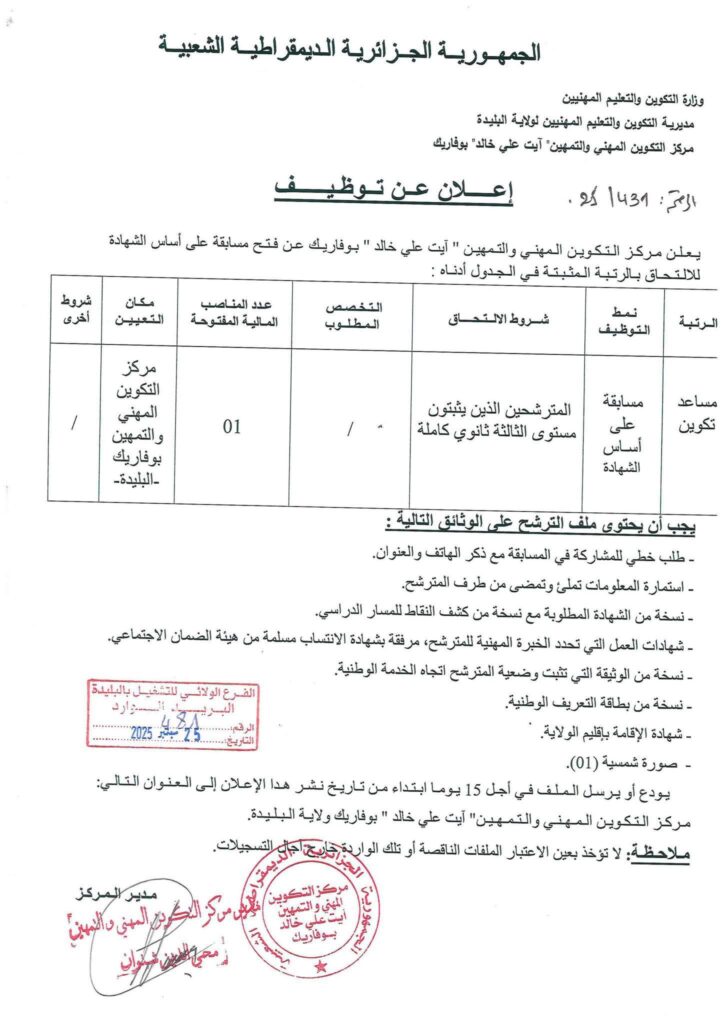 مساعد تكوين مسابقة على أساس الشهادة مستوى السنة الثالثة ثانوي كاملة 01 مركز التكوين المهني والتمهين “آيت علي خالد” – بوفاريك (البليدة)