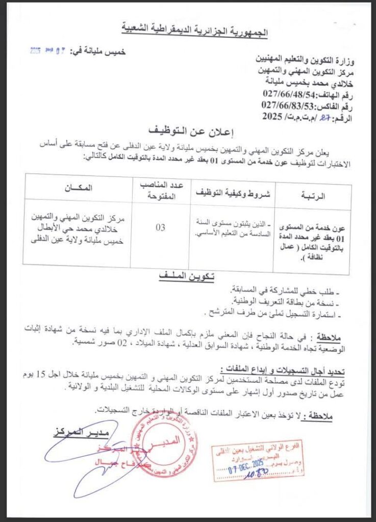 اعلان توظيف بمركز التكوين المهني والتمهين بخميس مليانة ولاية عين الدفلى