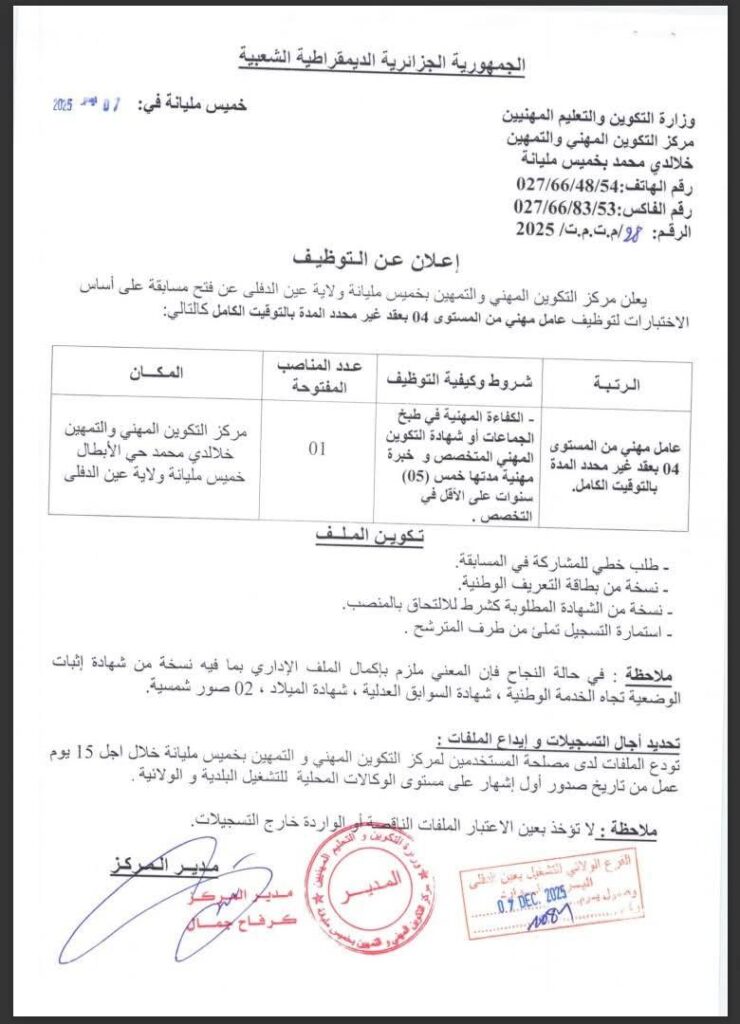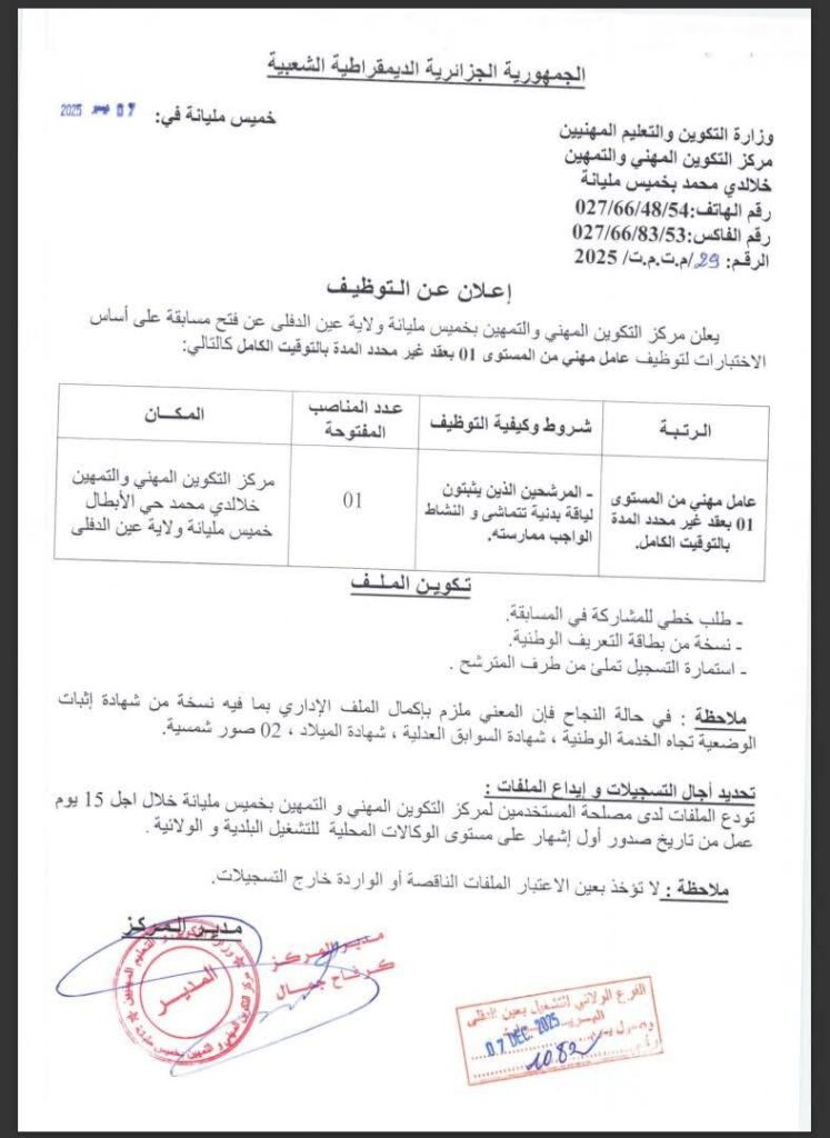 اعلان توظيف بمركز التكوين المهني والتمهين بخميس مليانة ولاية عين الدفلى