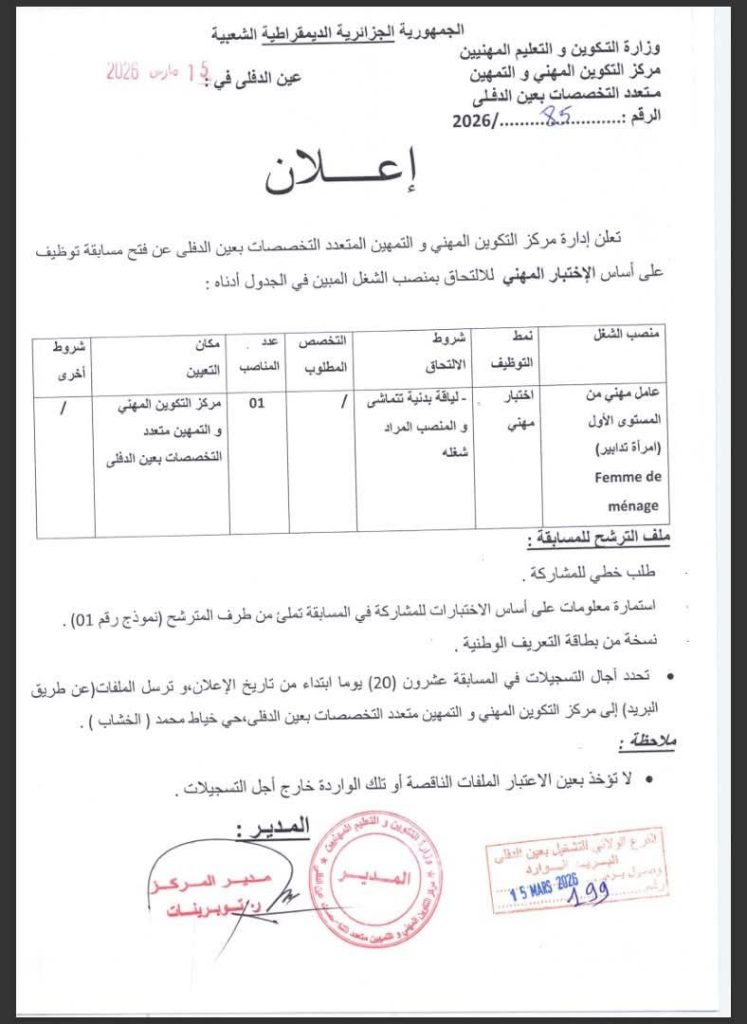 تعلن إدارة مركز التكوين المهني و التمهين متعدد التخصصات بعين الدفلى عن فتح مسابقة توظيف على أساس الإختبار المهني للالتحاق بمنصب الشغل المبين في الجدول أدناه :