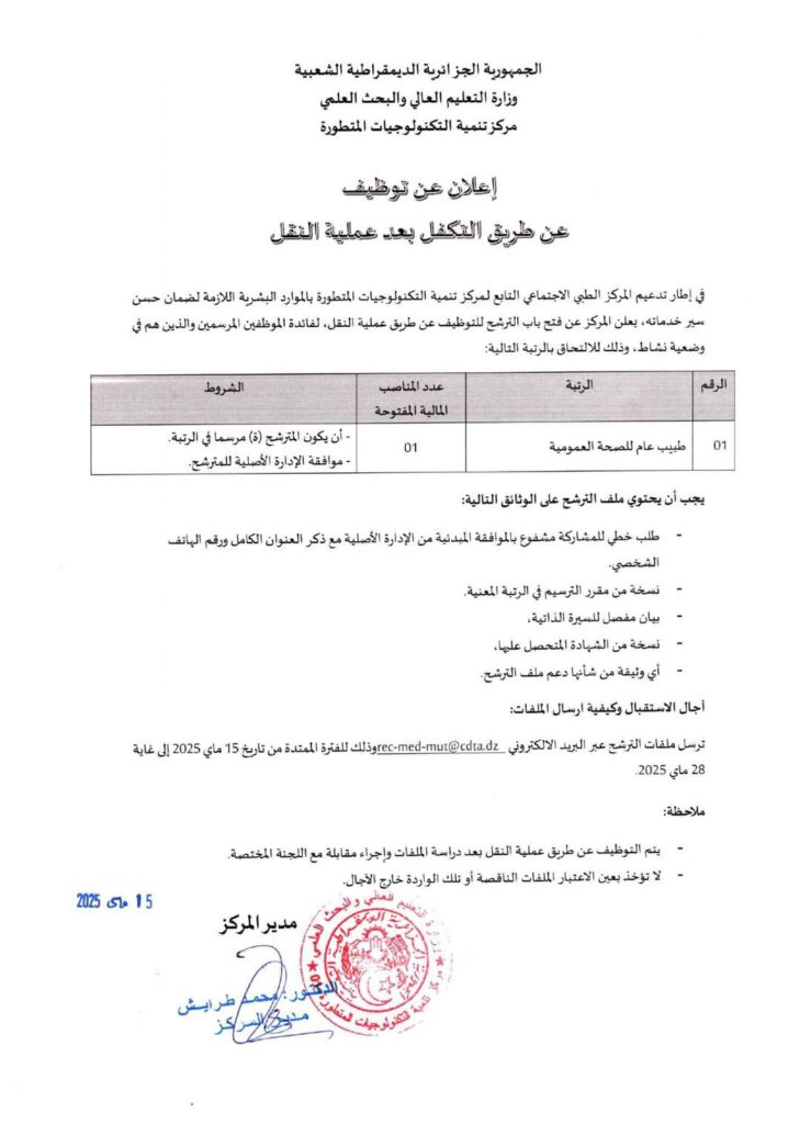 في إطار تدعيم المركز الطبي الاجتماعي التابع لـ مركز تنمية التكنولوجيات المتطورة بالموارد البشرية اللازمة لضمان حسن سير خدماته، يُعلن المركز عن فتح باب الترشح للتوظيف عن طريق النقل، لفائدة الموظفين المرسمين والذين هم في وضعية نشاط، وذلك للالتحاق بالرتبة التالية:
