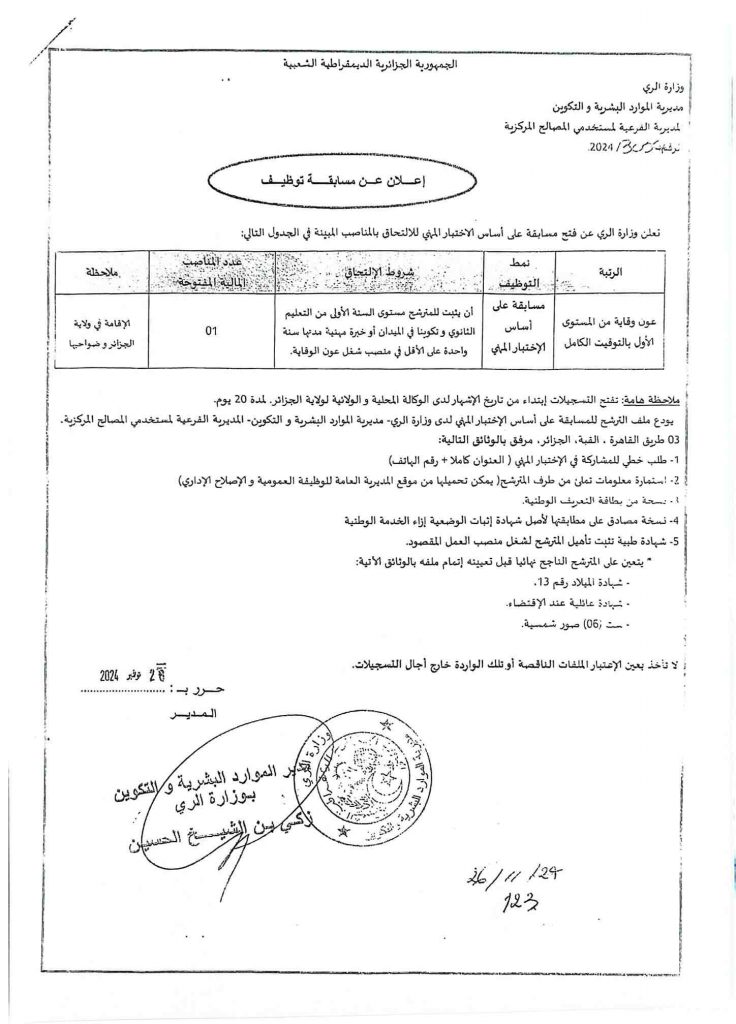 - يجب إيداع ملف الترشح للمسابقة على أساس الاختبار المهني لدى وزارة الري – مديرية الموارد البشرية والتكوين – المديرية الفرعية لمستخدمي المصالح المركزية، الكائنة في 03 طريق القاهرة، القبة، الجزائر.