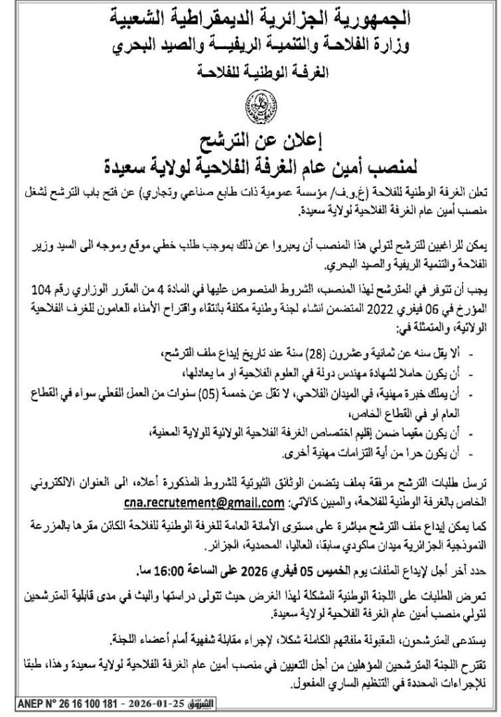 تعلن الغرفة الوطنية للفلاحة (غ.و.ف/ مؤسسة عمومية ذات طابع صناعي وتجاري) عن فتح باب الترشح لشغل منصب أمين عام الغرفة الفلاحية لولاية سعيدة.