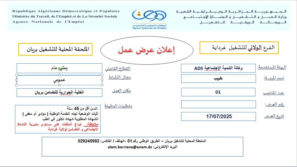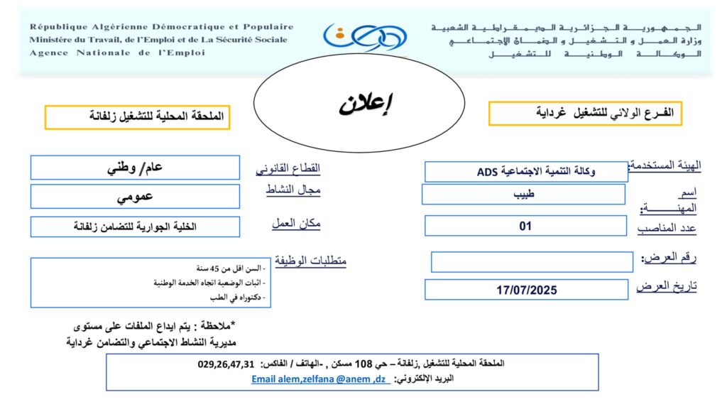 تعلن الملحقة المحلية للتشغيل زلفانة عن توفر منصب شغل على مستوى