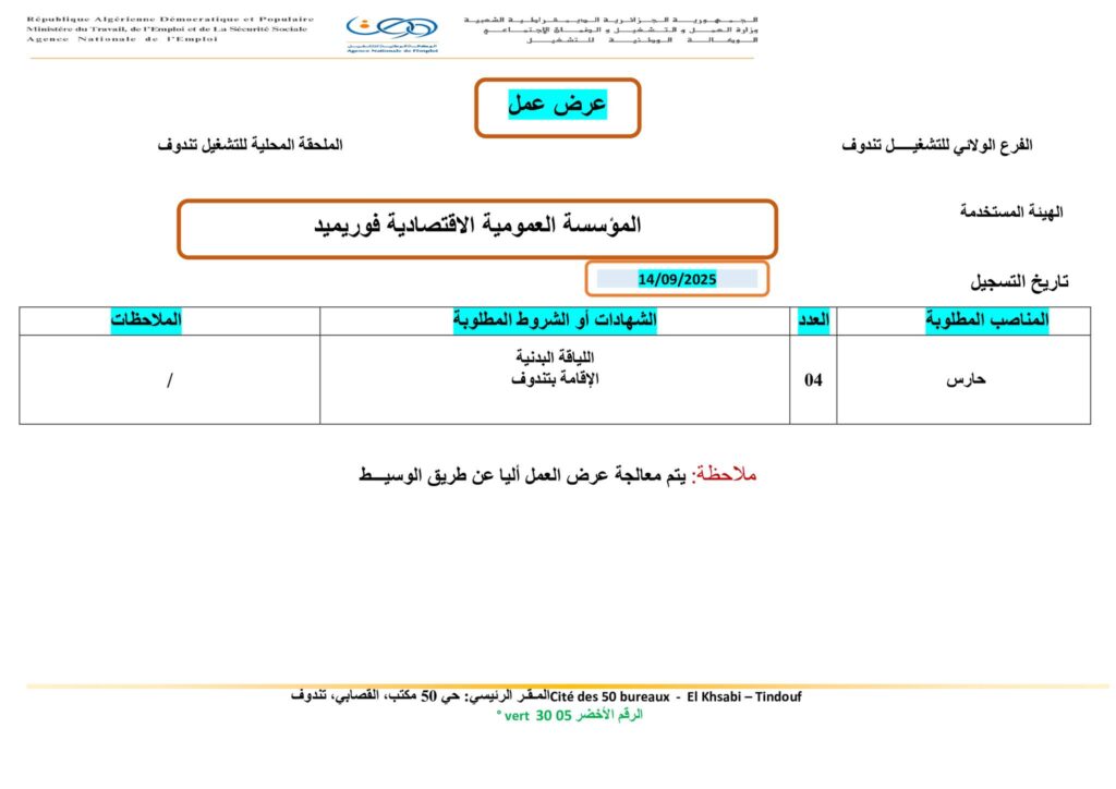 اعلان توظيف حراس امن في المؤسسة العمومية الاقتصادية فوريميد