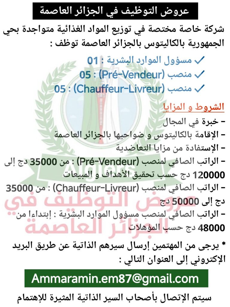 شركة خاصة مختصة في توزيع المواد الغذائية متواجدة بحي الجمهورية بالكاليتوس بالجزائر العاصمة توظف: