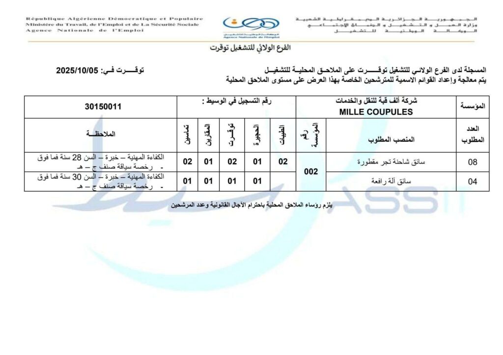 تعلن الوكالة الوطنية للتشغيل – فرع توقرت عن توفر مناصب عمل بشركة ألف قبة للنقل والخدمات (MILLE COUPULES)، وذلك حسب التفاصيل التالية: